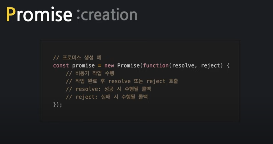 const promise1 = new Promise((resolve, reject) => {// 비동기 처리setTimeout(() => {if (Math.random() < 0.5){ // 0.5확률보다 작으면 즉 반반 확률resolve("성공");} else {reject("실패");}}, 1000);