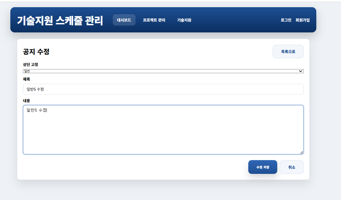 -> 공지 수정 폼. 등록부분에서 살짝 수정하고. 기존 상세화면 @GetMapping을 통해 내용 받아오고 @POSTMapping 으로 수정 까지 완료