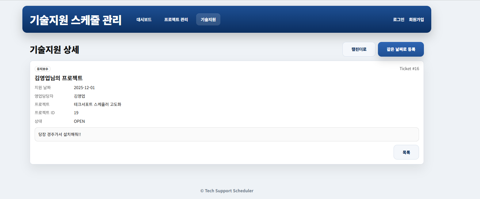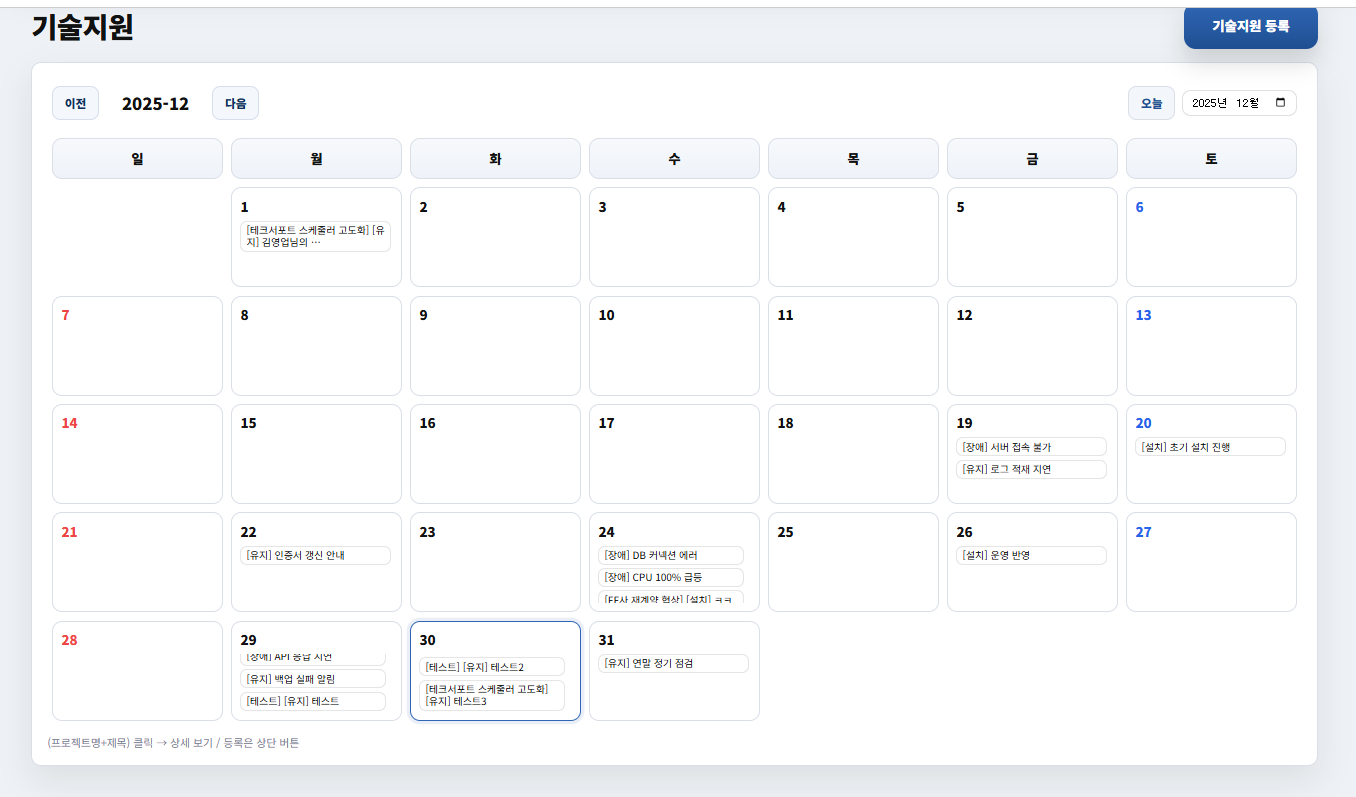오늘은 기술지원 등록 → 캘린더 출력 → 상세 조회 흐름을 한 사이클로 완성했다.